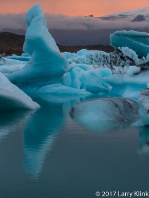 Between the eruptions, the glaciers provide the water for the many waterfalls and the lush, green, vegetation and wildflowers. Where the glacial tongues reach the plains, they calve icebergs into lagoons. At one of the most popular lagoons, Jökulsárlón, a short river provides an outlet for the icebergs to flow to the ocean as the tides recede. When the tides return, many of the icebergs wash back onto the black sand beach. It is a wonder to behold.