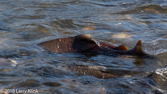 In November and December, the Chinook or King Salmon make their run into rivers along the Pacific Coast to spawn. Here, in Sacramento, they spawn in the American River. They lay their eggs in gravelly nests in shallow river beds. They need clean, cool, oxygenated, sediment-free fresh water for their eggs to develop. That means water that runs freely. Visiting Effie Yeaw Nature center yesterday, I got to watch some of the salmon preparing nests.They swam around in tight circles contorting their bodies and swishing their tail fins to clean any sediment from an area of river gravel. When they are done, the females will lay their eggs and the males will fertilize them. When finished spawning, both the males and females die. After the eggs hatch, those that survive mature for a few months then find their way to the ocean. If you walk along a river where salmon breed, look for an area where rocks are clean and shiny – it may be a salmon nest. They are usually about 6 feet by 2 feet.