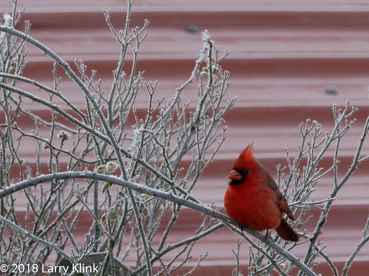 To be correct for the season, I should have had a cardinal on a bright green holly sprig draped with bright red berries and snow. However, I was in southeastern Oklahoma and had to settle for a frost covered crepe myrtle. But, the Northern Cardinal is a beautiful bird that looks lovely in almost any environment. I am happy to have gotten a few images to share with you. To my friends who celebrate Christmas, Hannukah, Diwali and Kwanza, may they brighten your holiday season. To those friends who don’t celebrate those holidays, may they brighten your week.