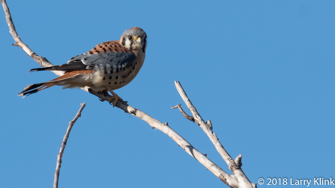 The American Kestrel is a small raptor; about the size of a robin. As you travel through rural, agricultural areas or open meadows, you might notice a small bird on a wire or pole. As you notice it, you may think: just another gray bird. But, if you slow down, you may be surprised by a beautiful little multi-colored bird. This small falcon eats lizards, insects and small birds. One of its hunting behaviors is fascinating to watch. It, will hover, flapping its wings, then dive down to capture its prey.