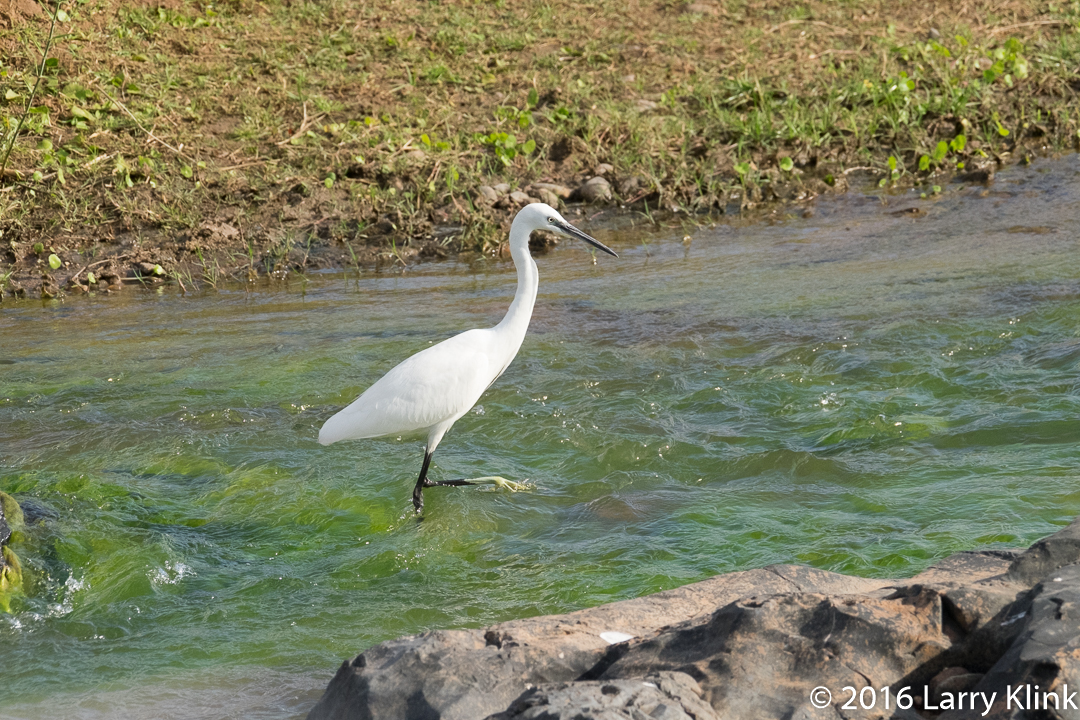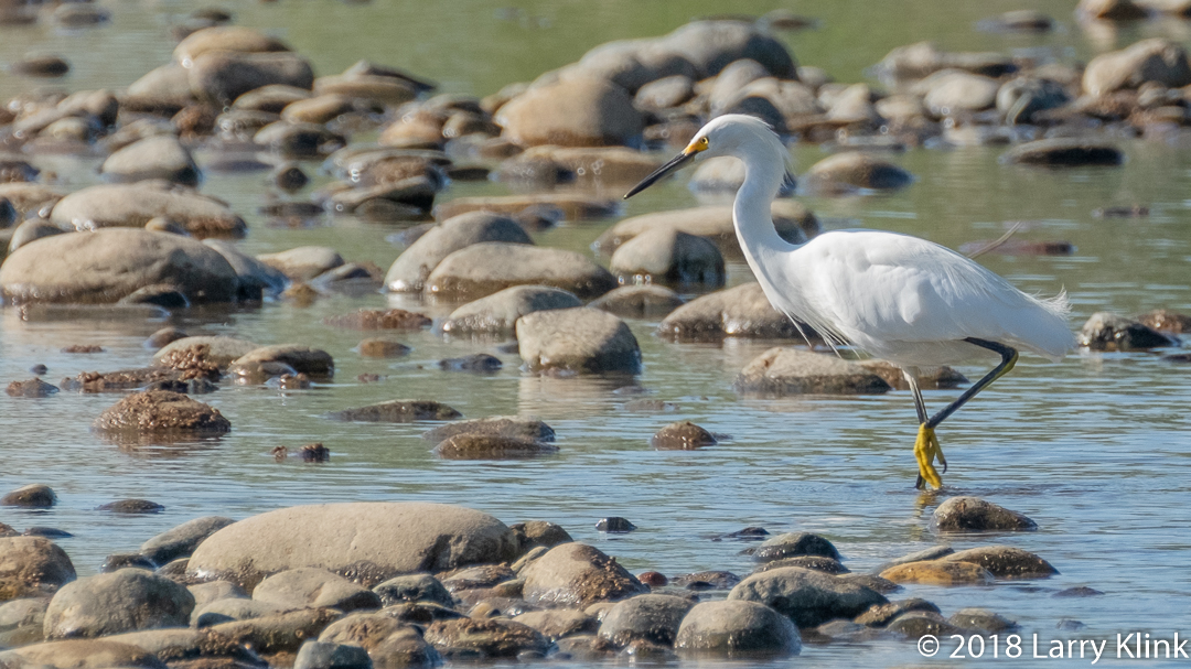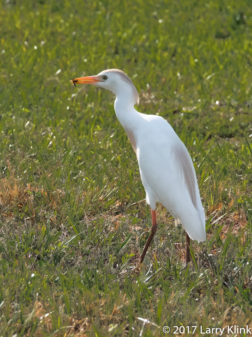 The Great Egret is a big guy. He has black legs and a yellow bill. The Snowy Egret is substantially smaller; it has a black bill with black legs and yellow-green colored feet. The Little Egret looks a lot like the snowy but the eye mask is a bit different color. The breeding male Cattle Egret has a brown head with a brown patch at the base of its neck and breast, and has some red on its legs. Otherwise, they are all white.