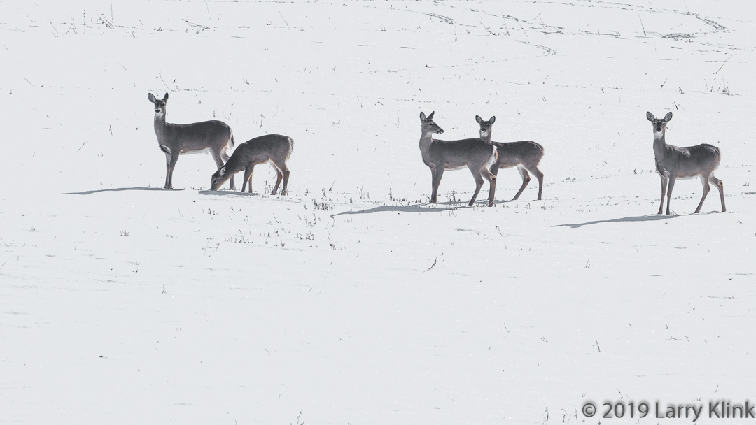 The White-tailed deer were spotted in rural southwestern Pennsylvania (US) grazing through some new fallen snow.