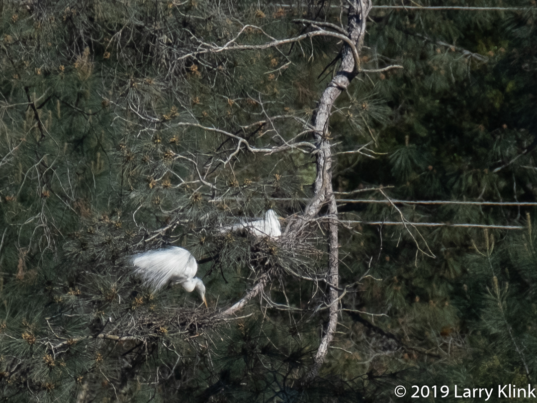 I visited both rookeries last week and it appears to me that the birds are sitting on eggs. If I am right, we should have babies soon. So, I’ll keep checking back and when I can, post pictures. I can’t get close to the nets; I am about 75 yards away. So, I won’t be able to photograph the chicks until they are big enough to pop their heads above the sides of the nest.
