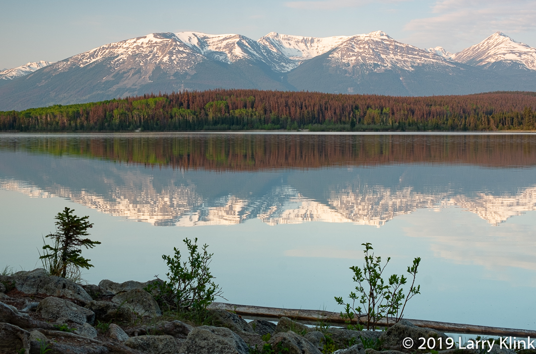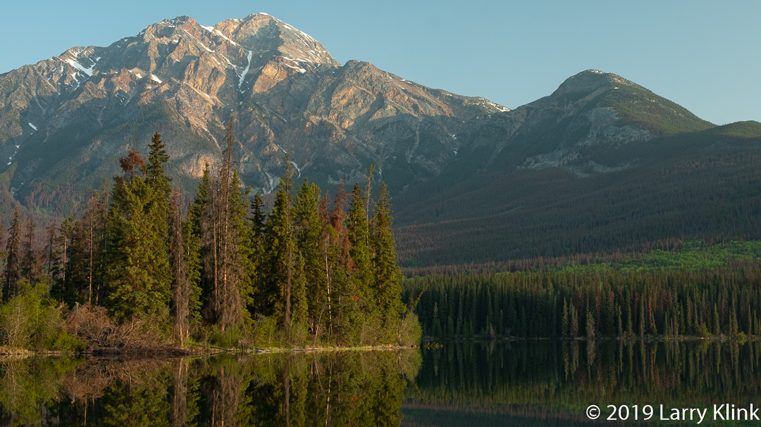 On this morning we had an almost perfectly clear, blue sky. The alpen glow on Pyramid Mountain made it glow in gold, orange and red. A large portion of the evergreen forest at its base was colored a rusty red; sad and unfortunate damage caused by the mountain pine beetle. But it added depth and color.