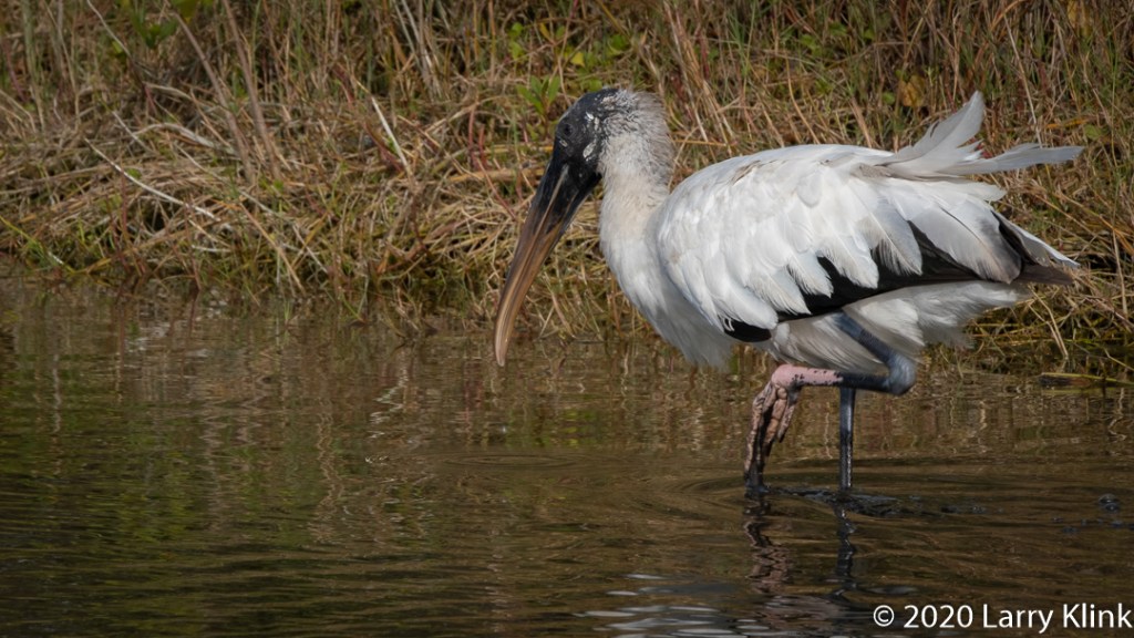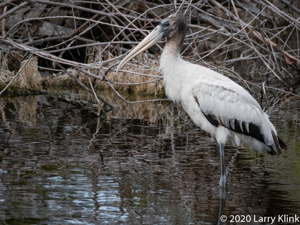 The Wood Stork (Mycteria Americana) is a large bird that is found in the swamps and wetlands of coastal Florida, Georgia and South Carolina. It can also be found in Cuba and Mexico. It hunts for fish and crustaceans while walking slowly with its beak in the shallow water. I watched one hunt. It had its beak submerged but used its feet to stir up the muddy bottom.