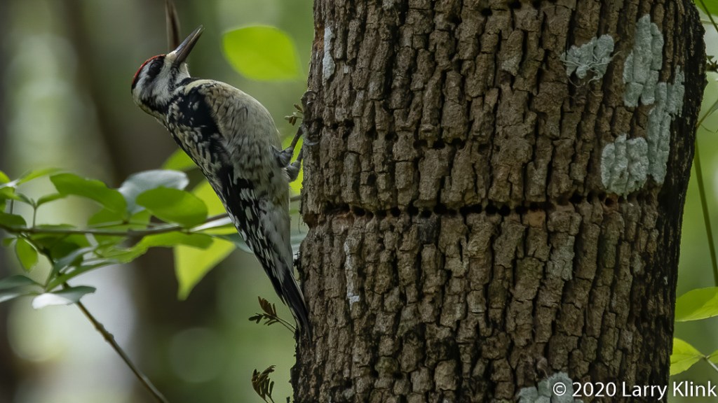 Look closely at the Yellow-bellied Sapsucker and notice the tree on which it is perched. Note the ring of holes around the tree. When a sapsucker feeds it moves around the trunk leaving a tell tale ring of holes around the tree.