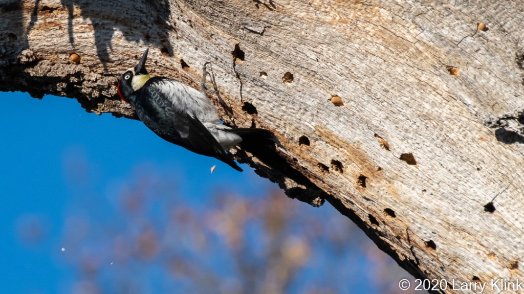 Chipping away, the Acorn Woodpecker prepares another hole in which it will store an acorn. Note the flying wood chips.