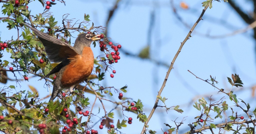 The iconic bird Christmas card in the culture of the USA is “Currier and Ives” style Northern Cardinal, its bright red contrasting against a bright green holly bush capped with snow and adorned with red berries. I’ve never been anywhere that I have seen that scene in nature. A few weeks ago, I was in the Seattle area. It was a sunny day with blue skies and some American Robins were feasting on red berries from a Hawthorn tree. That’s close enough don’t you think?