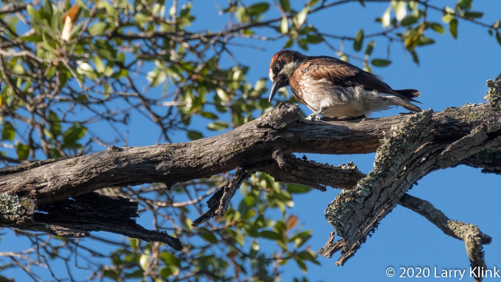 This is an Acorn Woodpecker. The Acorn Woodpecker uses its beak to drill holes where it stores acorns. Once the hole is ready, it will pound in an acorn for later use. ย In this picture, the woodpecker was drilling a hole. If you look closely, you can see wood chips in the air. Also note that some of the existing holes are empty and others have acorns.