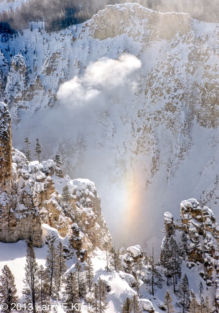 This “rainbow” can only be seen at sunrise in February at the Grand Canyon of the Yellowstone. I was on a photography workshop, camping in Yellowstone. It was a wonderful experience to be with a small group of like-minded people enjoying this rare opportunity.