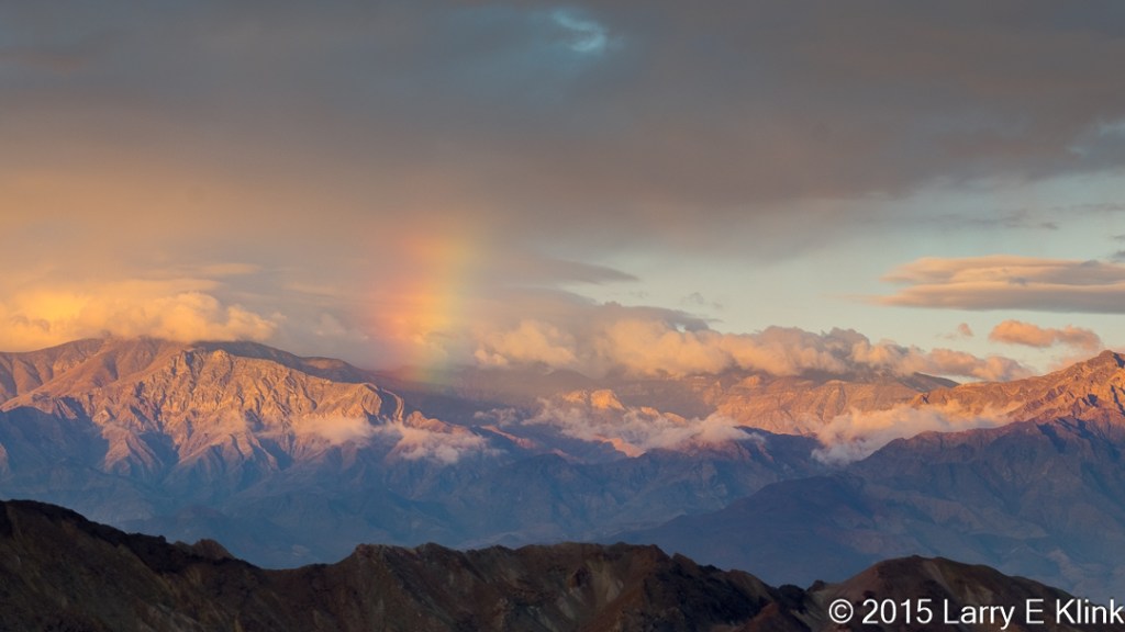 Zabriske point is the go-to place for a sunrise at Death Valley. On a typical day, the sun rises over your shoulder, casting an alpenglow over the mountains on the far side of the valley. If you are lucky, there will be a few clouds over the far mountains, and you can watch the sky turn from orange and magenta to gold. On the day we visited, the thick cloud cover from the previous day’s storm was breaking up. We got the beautiful color we had hoped for. But, in addition, we got a marvelous rainbow. It was an unforgettable moment.