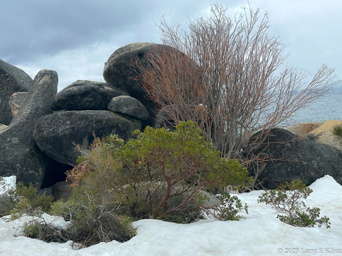 In April 2023, we visited the Lake Tahoe area. Coming off record snowfall, the houses on Route 89, along the Western Shore, were buried up to the roof tops. But along the Eastern Shore, the amount of snow was more manageable. The weather was overcast, windy and cold, though there were a few breaks in the clouds. Regardless of the weather, we visited Sand Harbor beach. It was a lovely experience; throwing snowballs, climbing rocks and at rare times, nice light.