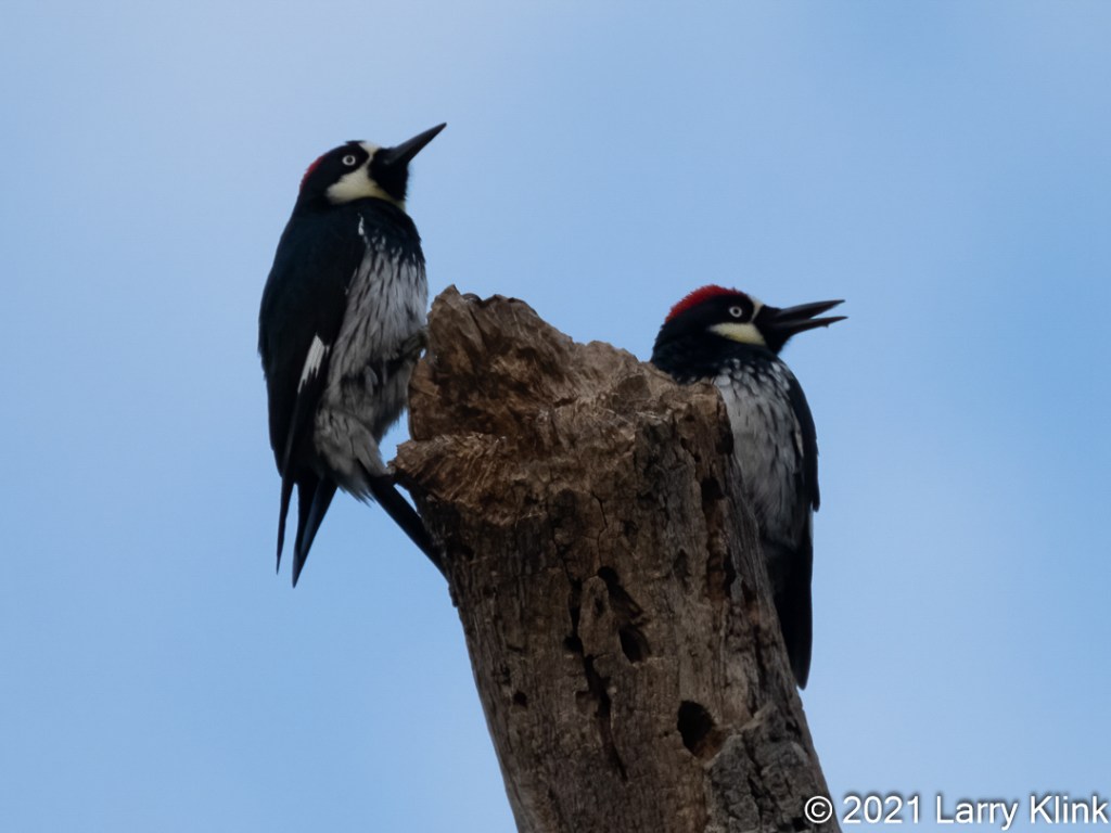 Acorn Woodpeckers are the most common woodpecker species that we see in the Sacramento, CA area. They are very active, industrious, and highly social birds. They live in family groups in a single nesting cavity, they manage a large acorn granary stored in holes they drill in dead trees, and they are very territorial.