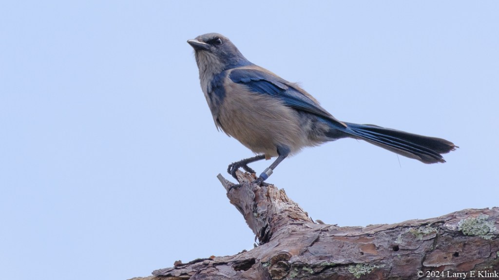 I’ve seen several varieties of Scrub-jays. On our visit to Merritt Island, I had planned to search for some. We found this one on a pine tree on a sandy trail among pines and low, scrubby brush. It was very cooperative.